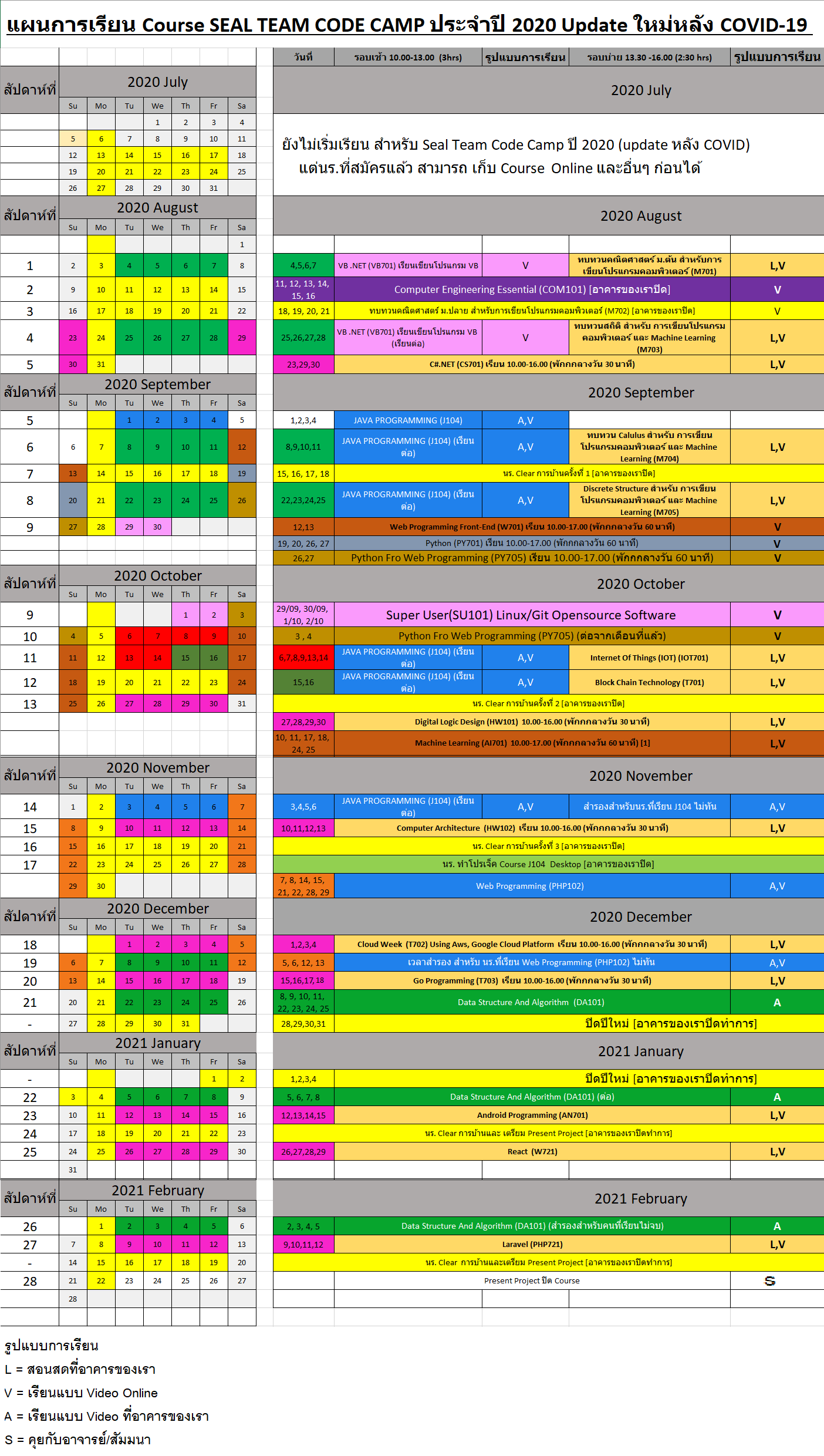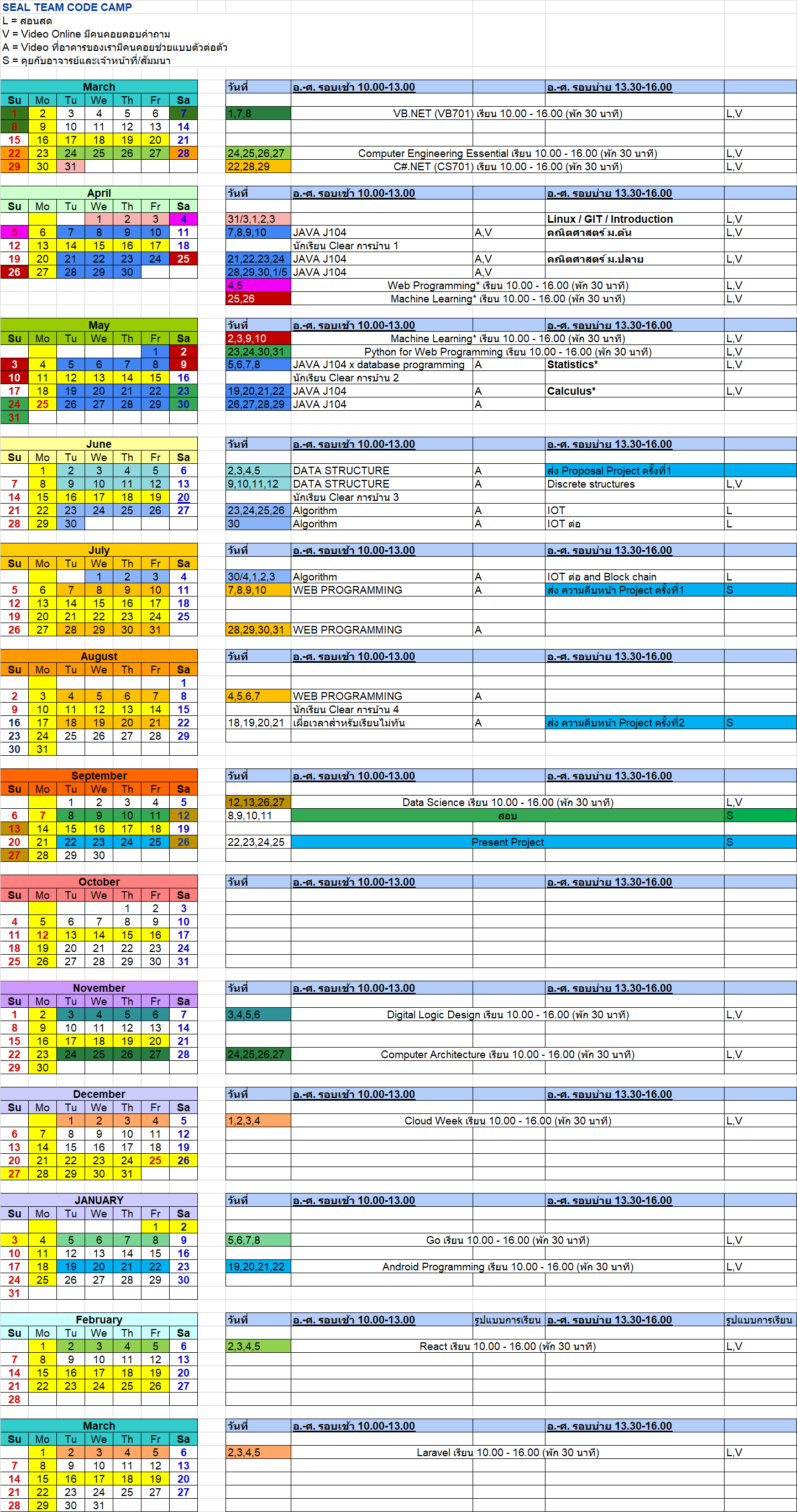 | SEAL | SEAL TEAM CODE CAMP เรียนกว่า 28 สัปดาห์ ระยะเวลาเรียนประมาณ 700 ชั่วโมง แบบปัดลง ไม่รวมเวลาทำการบ้าน ไม่รวมเวลาทำโปรเจกต์ | เรียนแบบ SELF + สอนสด + ONLINE |